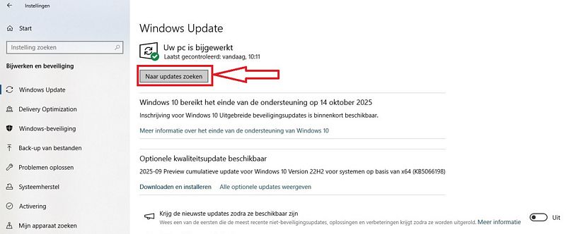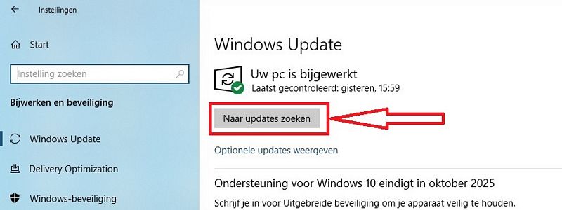- Verschijnt deze tekst niet, klik dan nogmaals op de knop: Naar updates zoeken