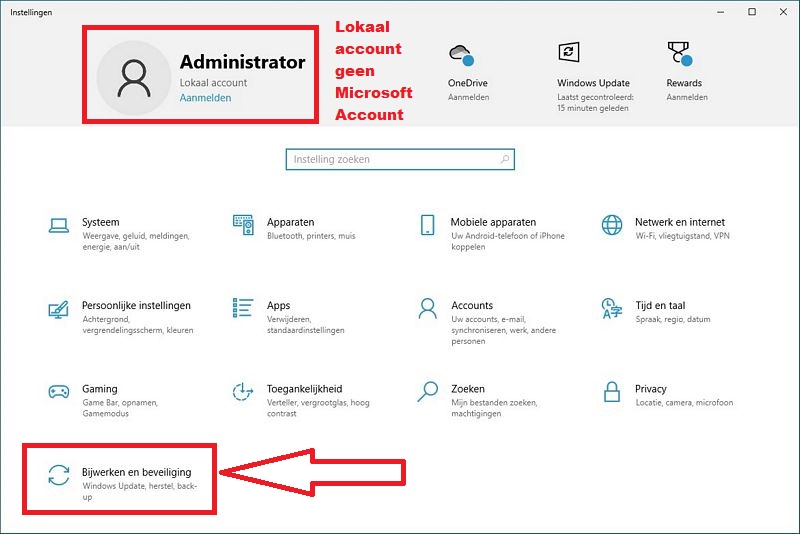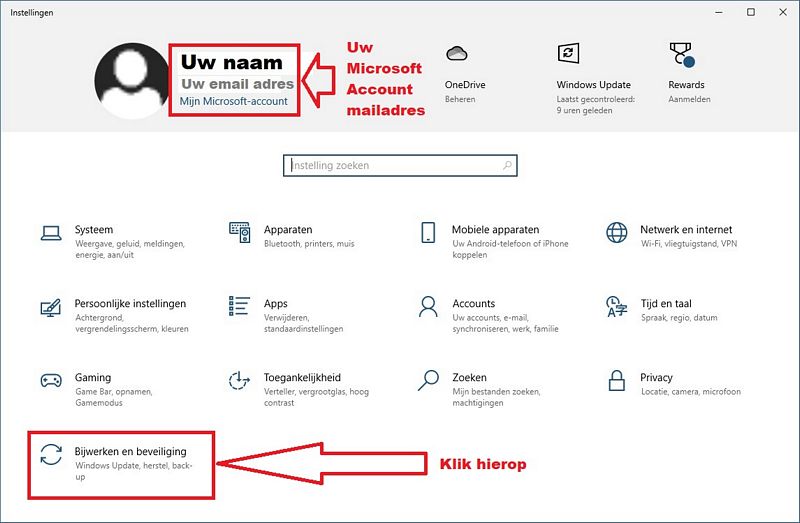 - Klik daarna in het Instellingen menu op de keuze: Bijwerken en beveiliging