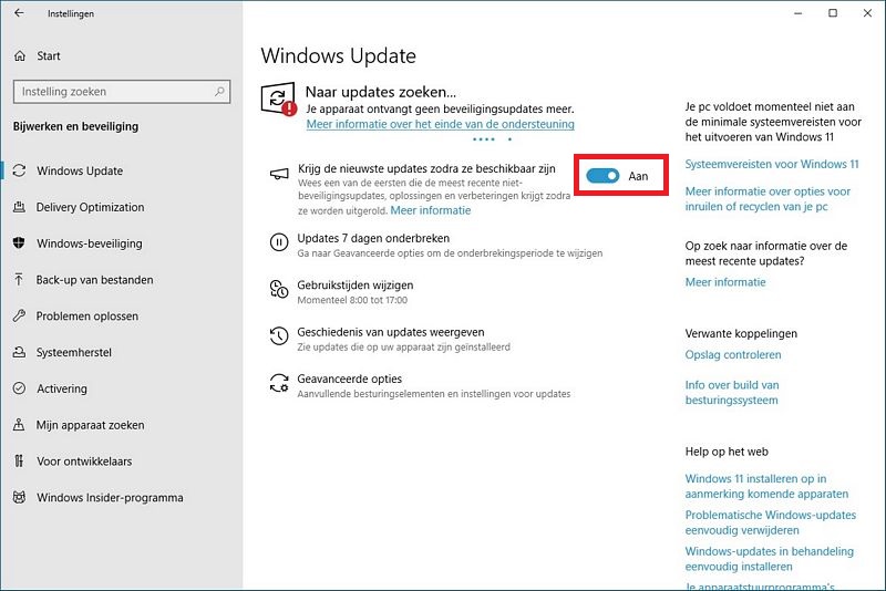 Zet desgewenst de schakelaar op AAN bij: 'Krijg de nieuwste updates zodra ze beschikbaar zijn.'