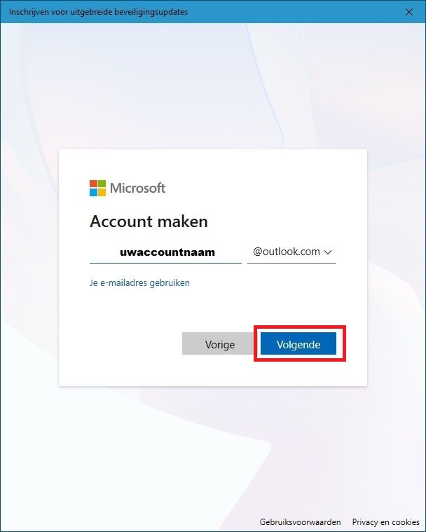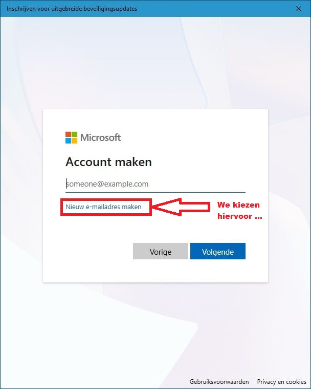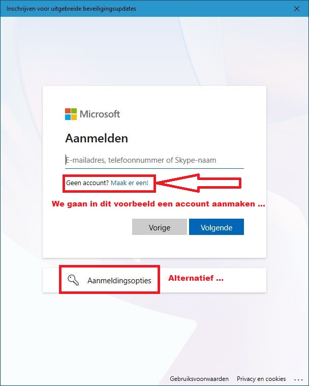 We hebben nog geen Microsoft Account, dus gaan we die nu hieronder aanmaken ...