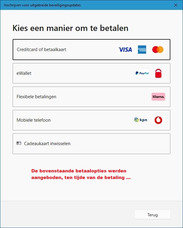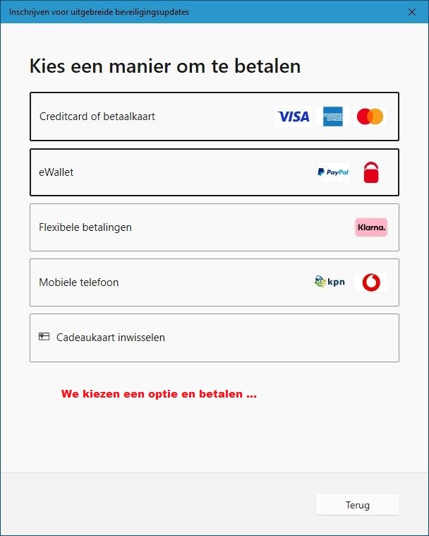 Heeft U geen mogelijkheid om te betalen, begin dan opnieuw en kies bij