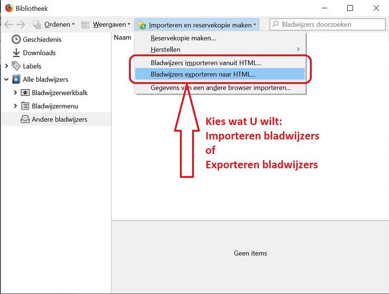- Kies of U bladwijzers wilt importeren of exporteren,BR>