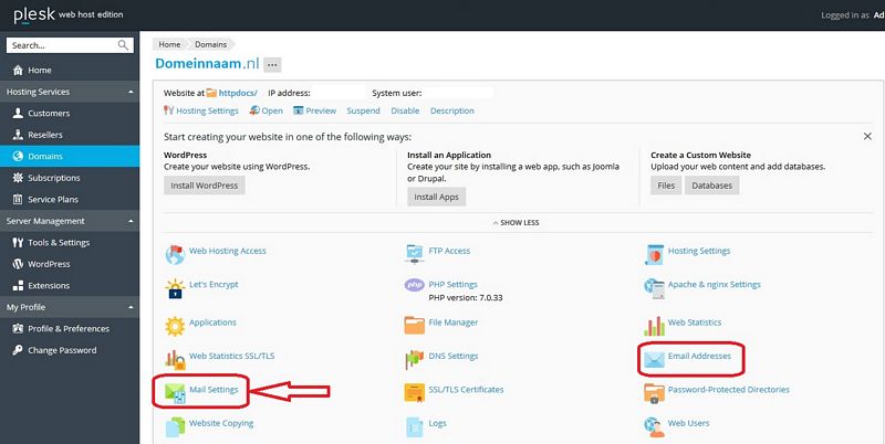 In dit voorbeeld komen we uit op de interface van Plesk hetgeen de beheeromgeving