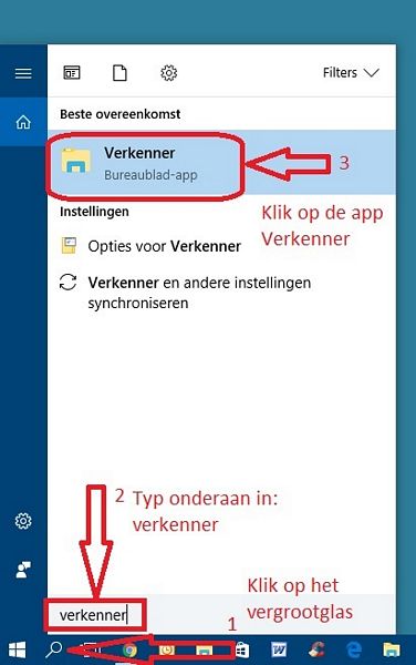 - Klik op het Vergrootglas of klik in het Zoekvlak en typ in het woord: Verkenner