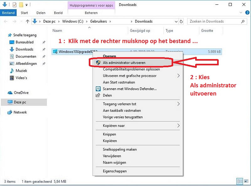 - Klik met de rechter-muisknop op het bestand met de naam: Windows10upgrade9252.exe
