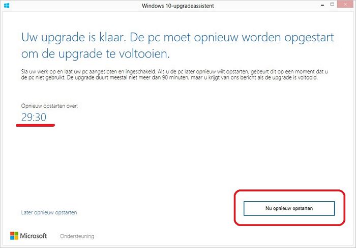 De upgrade naar Windows 10 is voorbereid en de computer dient opnieuw te worden